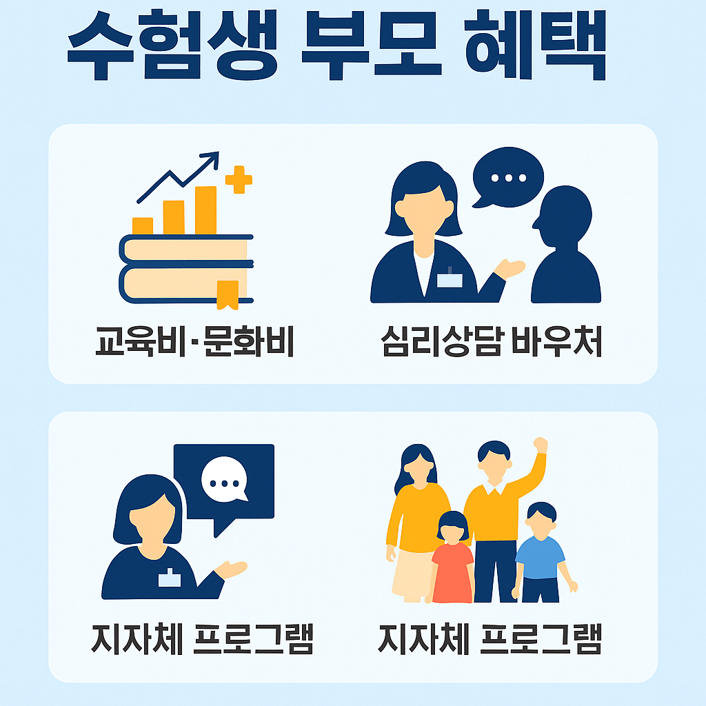 2025년 수능을 앞두고 수험생 가족이 받을 수 있는 정부·지자체 지원 혜택을 정리했습니다. 교육비·문화비, 심리상담 바우처, 지자체 프로그램에 알고 계신가요? 부모·가구 단위로 적용되는 교육비 지원, 상담·방과후 프로그램, 교통비·문화비 지원 등 꼭 필요한 정보만 모았습니다. 특히 2025년에는 학부모 부담 완화 정책이 강화될 예정이라 지금 확인하면 도움이 됩니다. 신청방법과 조회 링크도 함께 확인하세요.